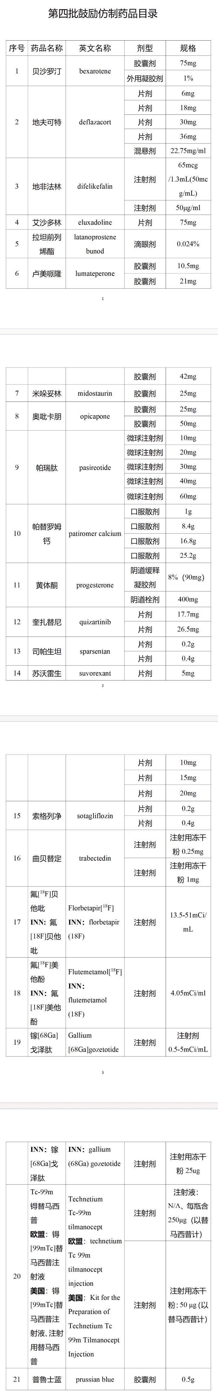 1月4日,国家卫生健康委联合工业和信息化部、国家知识产权局、国家医保局、国家药监局等部门组织专家对国内专利即将到期及临床供应短缺(竞争不充分)的药品进行遴选论证,制定了《第四批鼓励仿制药品目录》。第四批目录收录21个品种、47个品规。